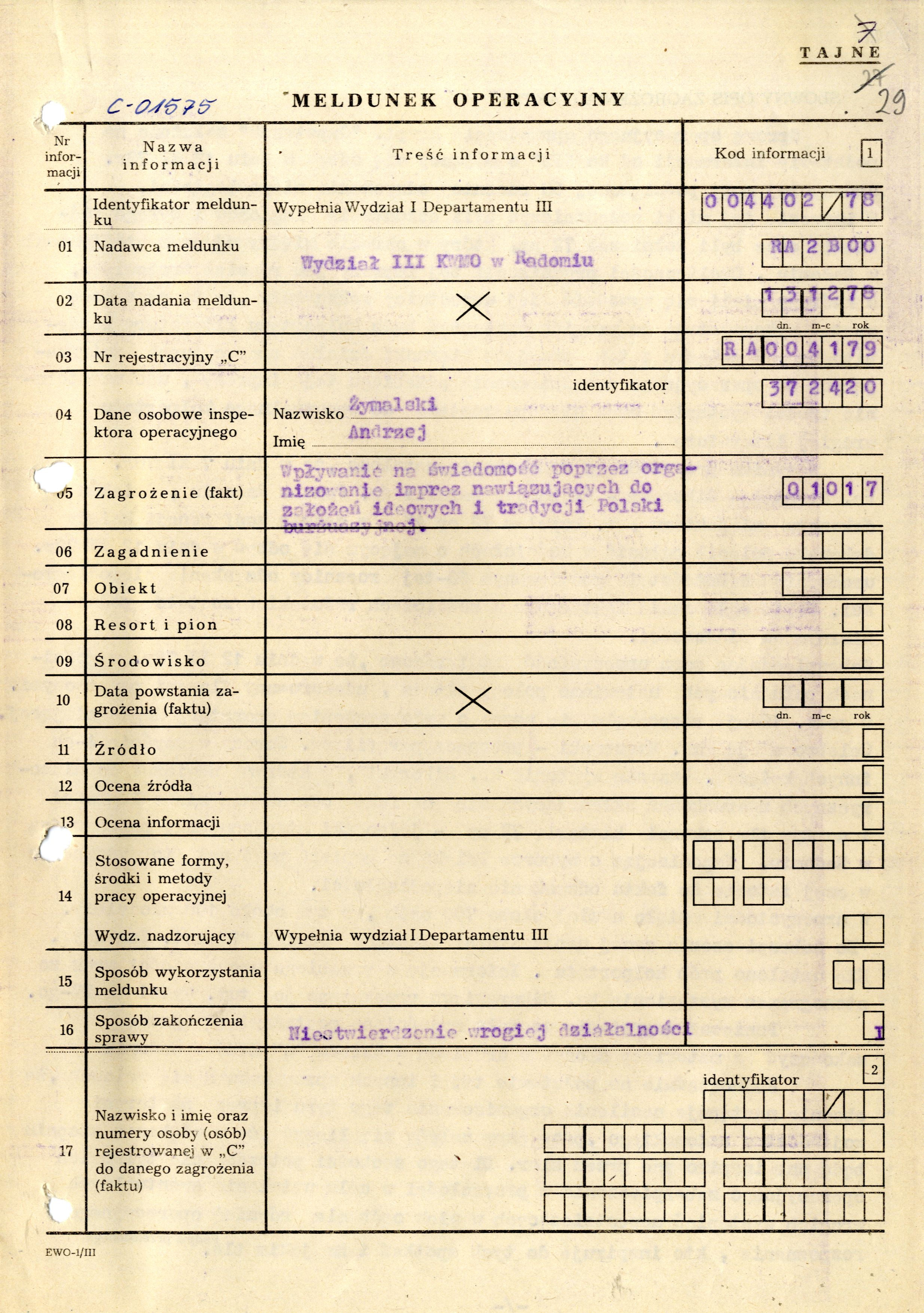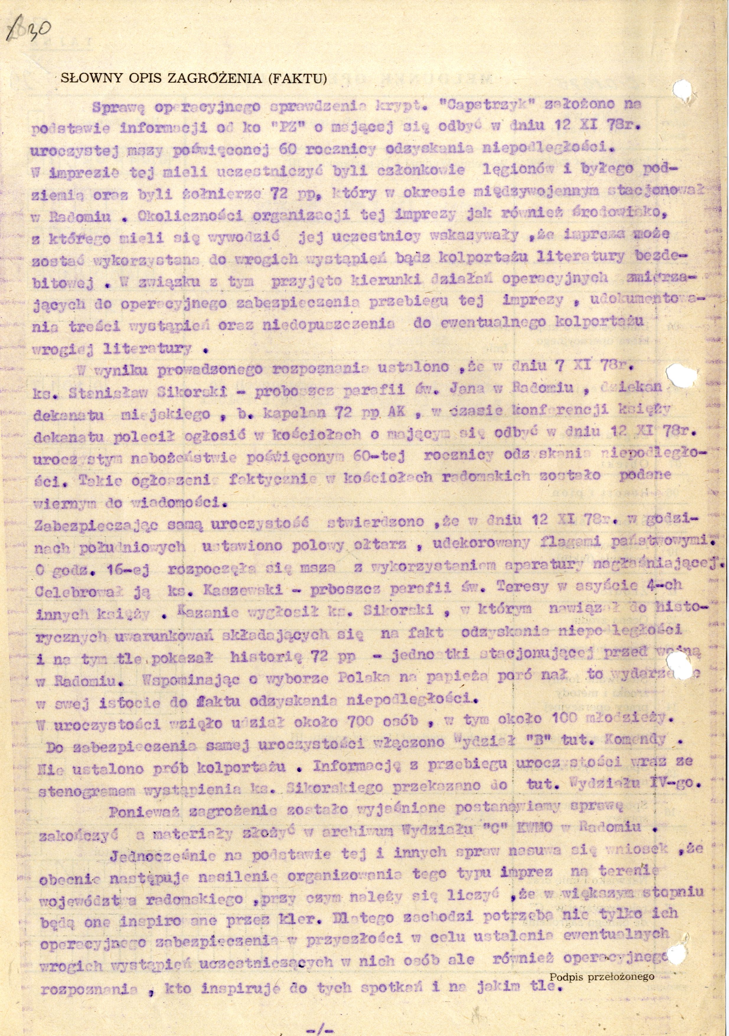 Meldunek operacyjny do sprawy operacyjnego sprawdzenia kryptonim „Capstrzyk” dot. uroczystości z okazji 60 rocznicy odzyskania niepodległości w dn. 12 XI 1978 r. w Radomiu, IPN Ra 08/185, s. 29-31. Pliki do pobrania Meldunek operacyjny do sprawy operacyjnego sprawdzenia kryptonim „Capstrzyk” dot. uroczystości z okazji 60 rocznicy odzyskania niepodległości w dn. 12 XI 1978 r. w Radomiu, IPN Ra 08/185, s. 29-31. (pdf, 522.45 KB) Opcje strony Poprzedni Strona Następny Strona Powrót do poprzedniej strony Drukuj tą stronę Generuj PDF z tej stronie Powiadom o tej stronie Udostępnij na Twitter