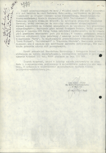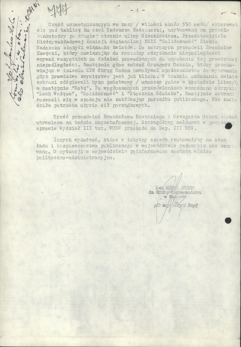 Meldunek dzienny WUSW w Radomiu dla MSW z dn. 11 XI 1988 r. informujący m.in. o przebiegu uroczystości w Radomiu z okazji 70 rocznicy odzyskania niepodległości, IPN Ra 02/65 t. 13, s. 774-777. Pliki do pobrania Meldunek dzienny WUSW w Radomiu dla MSW z dn. 11 XI 1988 r. informujący m.in. o przebiegu uroczystości w Radomiu z okazji 70 rocznicy odzyskania niepodległości, IPN Ra 02/65 t. 13, s. 774-777. (pdf, 681.06 KB) Opcje strony Poprzedni Strona Następny Strona Powrót do poprzedniej strony Drukuj tą stronę Generuj PDF z tej stronie Powiadom o tej stronie Udostępnij na Twitter