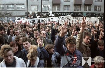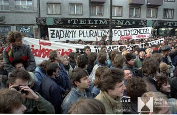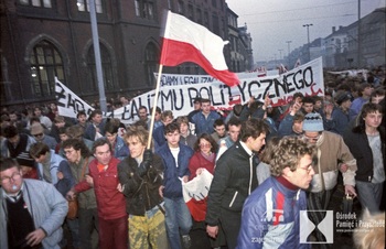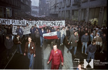 Fotografie Niezależnej Agencji Fotograficznej „Dementi” przedstawiające demonstrację we Wrocławiu, zorganizowaną przez Polską Partię Socjalistyczną i Solidarność Walczącą w 70. rocznicę odzyskania niepodległości. Fotografowie NAF Dementi: T. Kizny, A. Łoś, A. Łuc, H. Prykiel / Ośrodek „Pamięć i Przyszłość”.