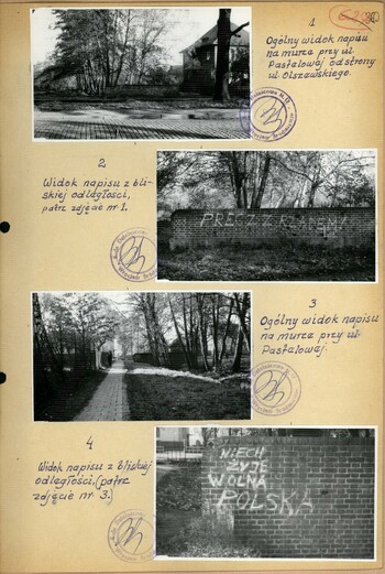 Notatka służbowa z dn. 21 XI 1966 r. dot. wykrycia antysocjalistycznych napisów na murze przy ul. Pastelowej we Wrocławiu z załączonymi zdjęciami, IPN Wr 053/1093, k. 351 i k. 360. Pliki do pobrania Notatka służbowa z dn. 21 XI 1966 r. dot. wykrycia antysocjalistycznych napisów na murze przy ul. Pastelowej we Wrocławiu z załączonymi zdjęciami, IPN Wr 053/1093 k. 351 i k. 360 (pdf, 1.21 MB) Opcje strony Następny Strona Powrót do poprzedniej strony Drukuj tą stronę Generuj PDF z tej stronie Powiadom o tej stronie Udostępnij na Twitter