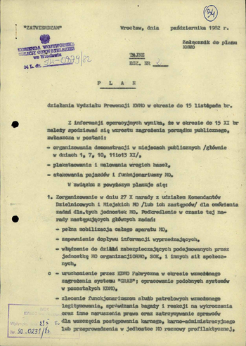Plan działania Wydz. Prewencji KWMO we Wrocławiu w okresie do 15 XI 1982 r., IPN Wr 290/21, k. 34–36.