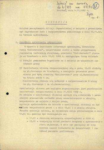 Koncepcja działań porządkowych Milicji Obywatelskiej z dn. 4 XI 1982 r. w związku z przewidywanym zagrożeniem ładu i bezpieczeństwa publicznego w dn. 10 XI 1982 r. na terenie m. Wrocławia, IPN Wr 290/21, k. 45–52.